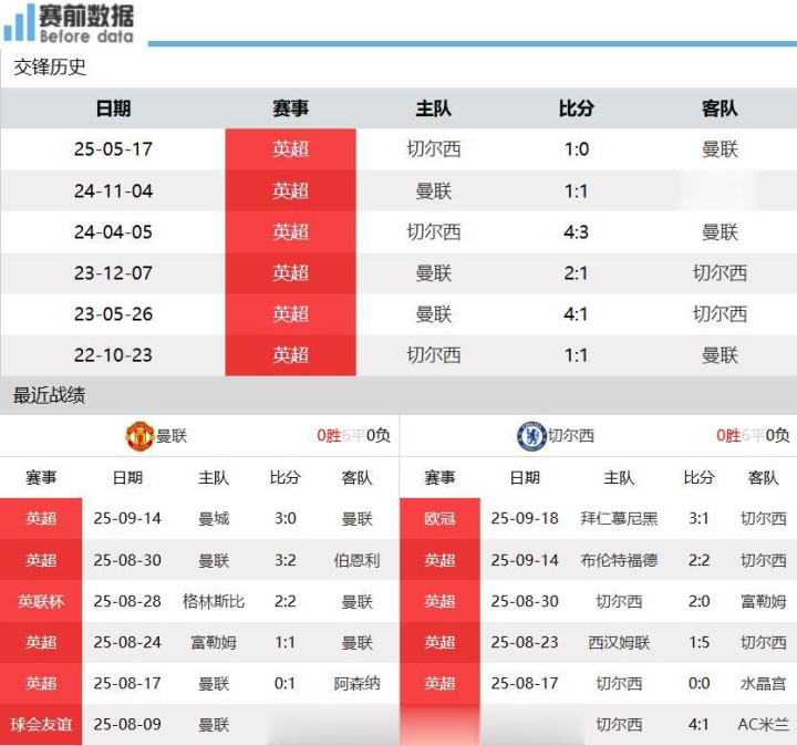 第一:两队情况!英超前4轮战罢,曼联1胜1平2负积4分排名第十四;切尔西2胜2平保持不败,积8分排名第五。上轮英超,曼联客场0-3完败给曼城,没有库尼亚,曼联进攻全无;切尔西客场2-2遭布伦特福德绝平,周中欧冠客场1-3不敌拜仁。